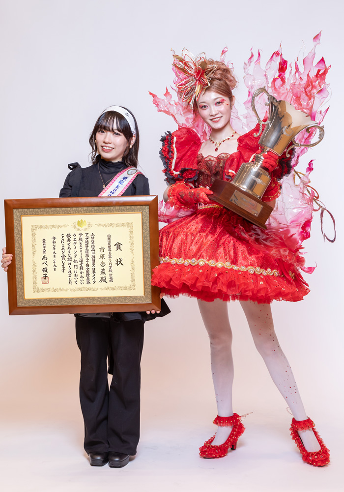 kawaii大使という名誉ある賞を頂くことができ、とても嬉しく思います。 校内の予選から長い時間をかけて1つの作品をつくるなかで、改めて物作りの楽しさやメイクをする楽しさを再認識できた期間でもありました。最後まで支えてくれた先生方や友人、たくさん協力をしてくれたモデルさんに感謝しております。